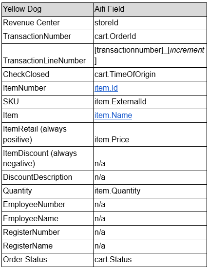 Ensuring that all AiFi items have an ExternalID that matches to the corresponding Yellow Dog SKU, or UPC, or, if opting to use POS Item Mapping only, for mapping items via POS Item Map