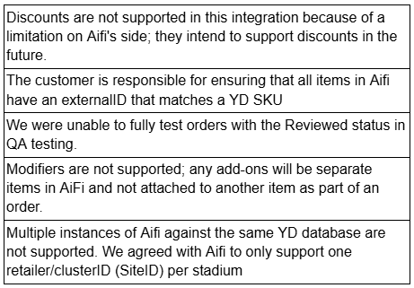 This integration supports a single AiFi clusterID per Yellow Dog database; i.e., multiple instances of AiFi per Yellow Dog database are not supported, and neither are multiple Yellow Dog databases per AiFi instance.
